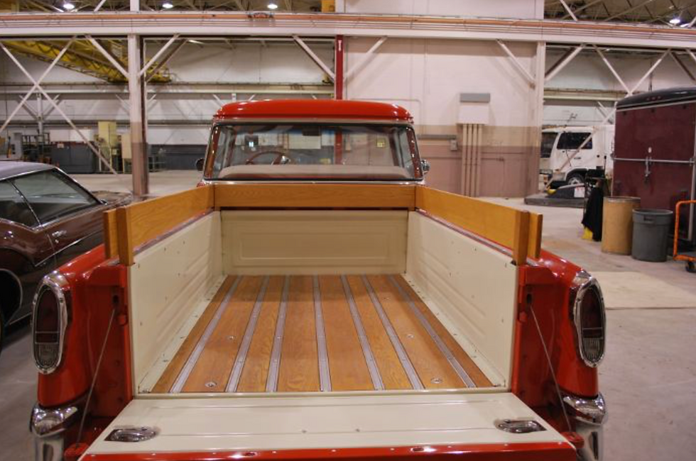 This vehicle has 15,451 miles on it and is in very good over condition. It is equipped with a 265 cid engine and an automatic transmission. Extra include cloth interior, seat belts, AM radio, visors, dual mirrors, and dual exhaust. It also has white wall tires with full wheel covers. The truck bed has a finished wood floor and removable wood bed sides. The body and paint, as well as the chrome, trim, and interior, are all in very good condition.
